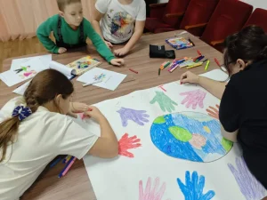 После обсуждения и активной работы над пониманием толерантности, ребята перешли к более творческой части программы. Им было предложено нарисовать планету Земля, окруженную ладошками разных цветов. Этот символ стал визуальным воплощением единства в многообразии, отражая идею о том, что, несмотря на наши различия, мы все живем на одной планете и должны бережно относиться друг к другу.