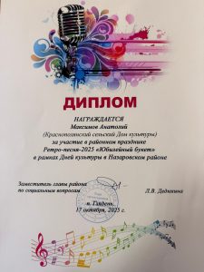 17 октября в Гляденском Доме культуры проходил районный праздник ретро-песни «Юбилейный букет». Краснополянский СДК принял в этом замечательном фестивале активное участие представив два номера: песня «А в ресторане» и «Я вспоминаю». Атмосфера мероприятия была очень теплой и зажигательной.